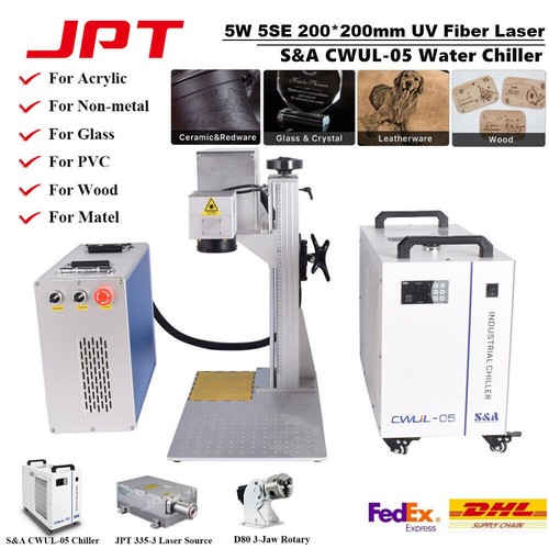 JPT 5W UV Laser Marking Machine with 6.9×6.9in Lens and Water Chiller. Voltage: 110-220V. Frequency: 20-150Khz. Laser Wavelength: 355nm. Beam Quality of M2 <1.2. Engraving Depth≤0.016in